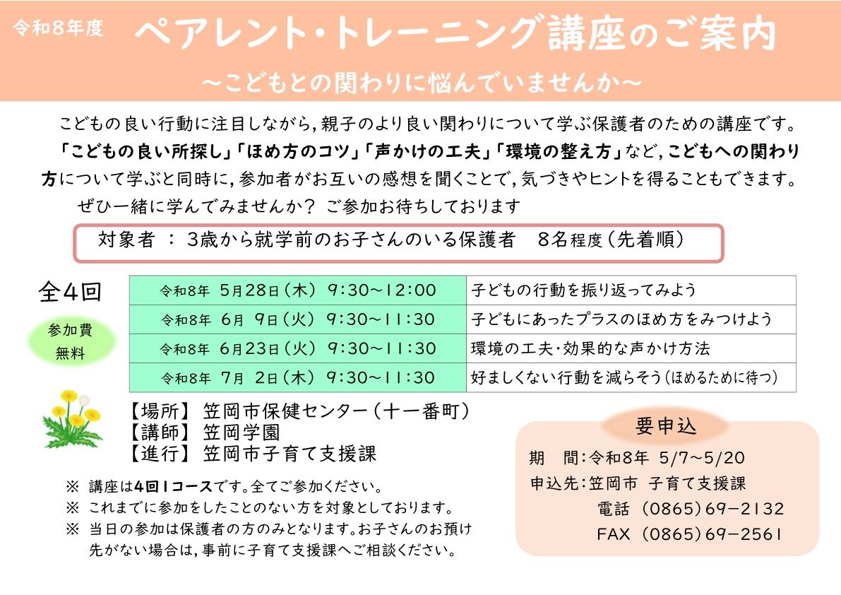 こどもの良い行動に注目しながら,親子のより良い関わりについて学ぶ保護者のための講座です。「こどもの良い所探し」「ほめ方のコツ」「声かけの工夫」「環境の整え方」など,こどもへの関わり方について学ぶと同時に,参加者がお互いの感想を聞くことで,気づきやヒントを得ることもできます。ぜひ一緒に学んでみませんか? ご参加お待ちしております。PDFファイル市のHPからも確認できます。>>詳細はこちら